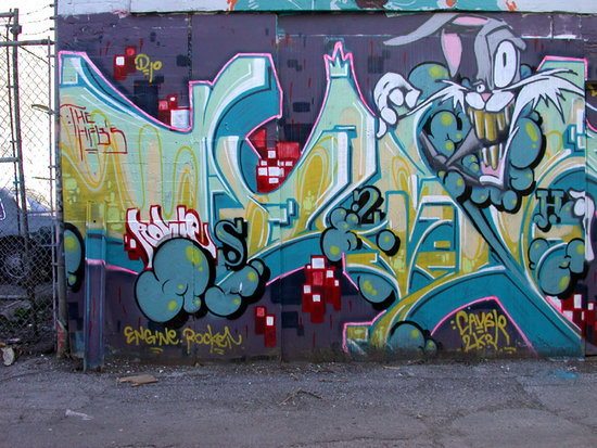 Notes:This back alley area was covered with pieces. The chain link fence seen in the first image partitioned off College and Bathurst Alley Mural (3).