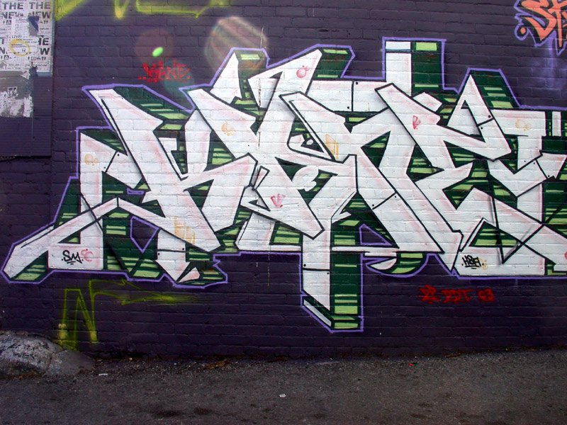 Notes:This back alley area was covered with pieces. This is the opposite wall to College and Bathurst Alley Mural (1).